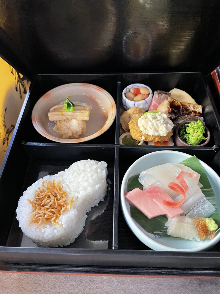 ひとつは、黒塗りの十字の仕切りがついた器におさめる「松花堂弁当」です。