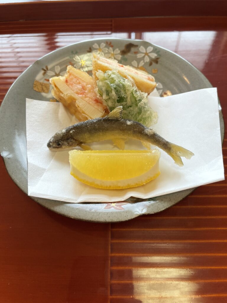 サクッとした歯ごたえが楽しい「筍(たけのこ)の挟み揚げ」と、ほのかな苦味が心地よい「稚鮎(ちあゆ)の天ぷら」を盛り合わせました。季節の移ろいを、目と舌でじっくりと味わっていただけます。