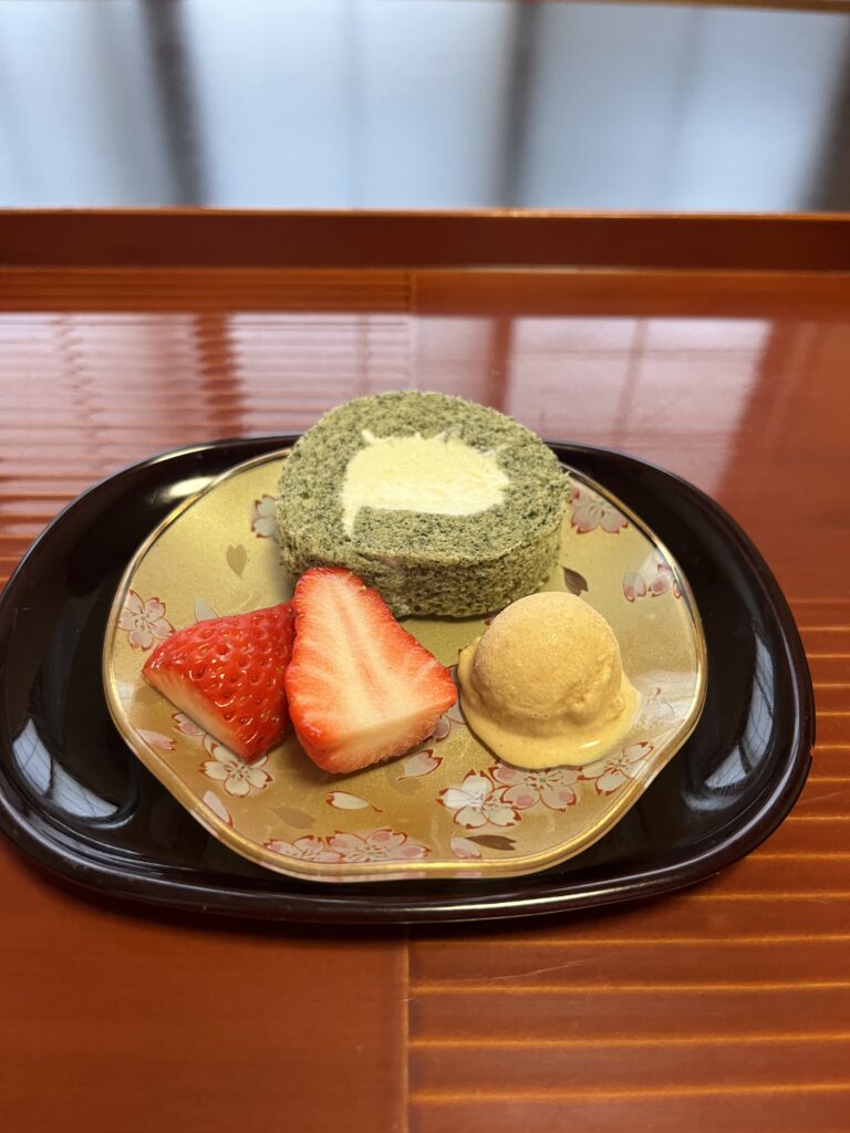 ロールケーキに寄り添うように添えているのは、瑞々しい紅色の苺と、淡い色合いのきな粉アイスクリームです。